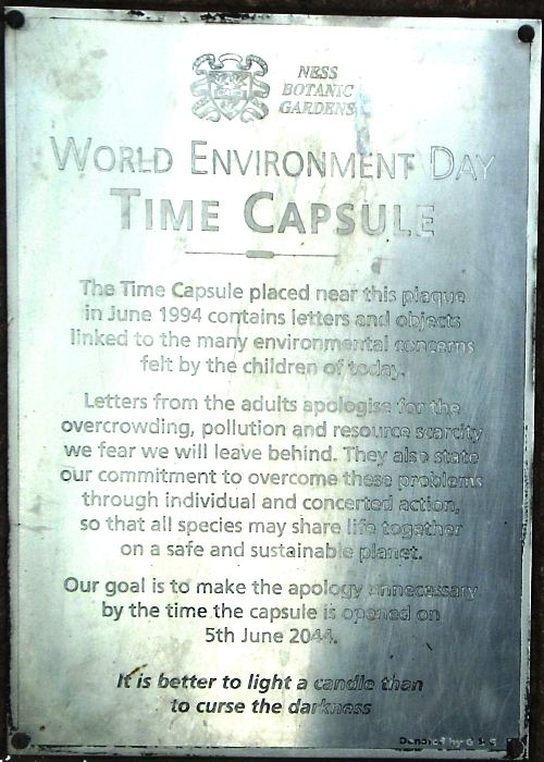 Fifteen years ago today, this time capsule was ‘planted’ in Ness Gardens on the Wirral; and now we see sitting by it a little person who will be 35 years old when the capsule is opened. What will her world be like? Will we have made it a good and safe place for her and her own children to live in? And are we moving in the right direction, now, to ensure this will happen? Do we now understand what ‘sustainable’ living entails? Can we ensure that future generations – not the ones who felt obliged to ‘apologise’ in the time capsule letters – will manage to live sustainably and well?