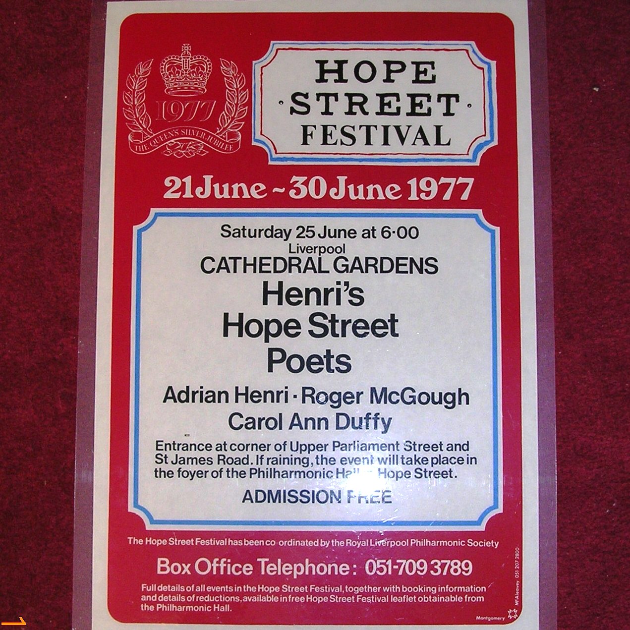 In 1977 the Silver Jubilee was a more elaborate affair, initiating as it did the first Hope Street Festival, a programme of events led by Andrew Burn with the Royal Liverpool Philharmonic Orchestra, alongside original Hope Street visionaries such as Adrian Henri and Paddy Byrne.